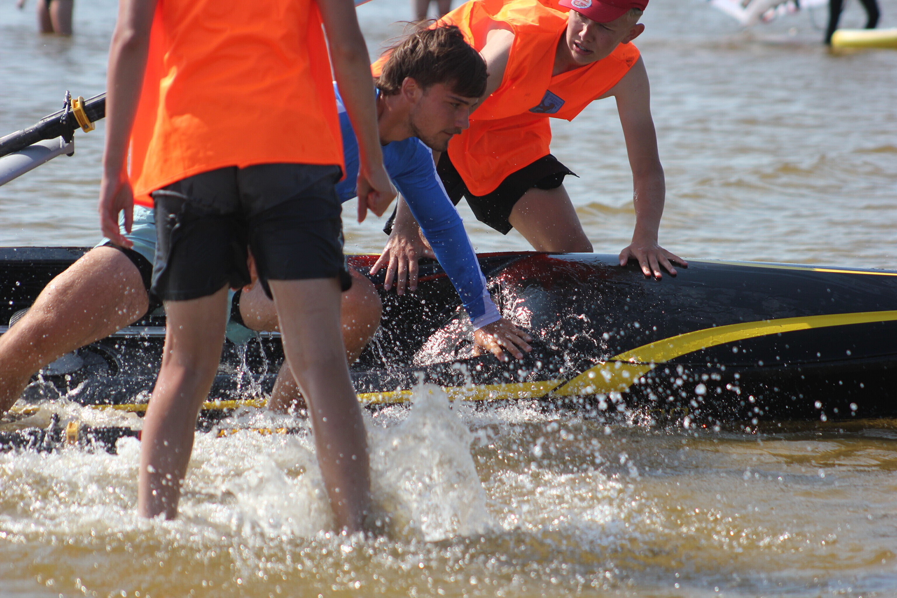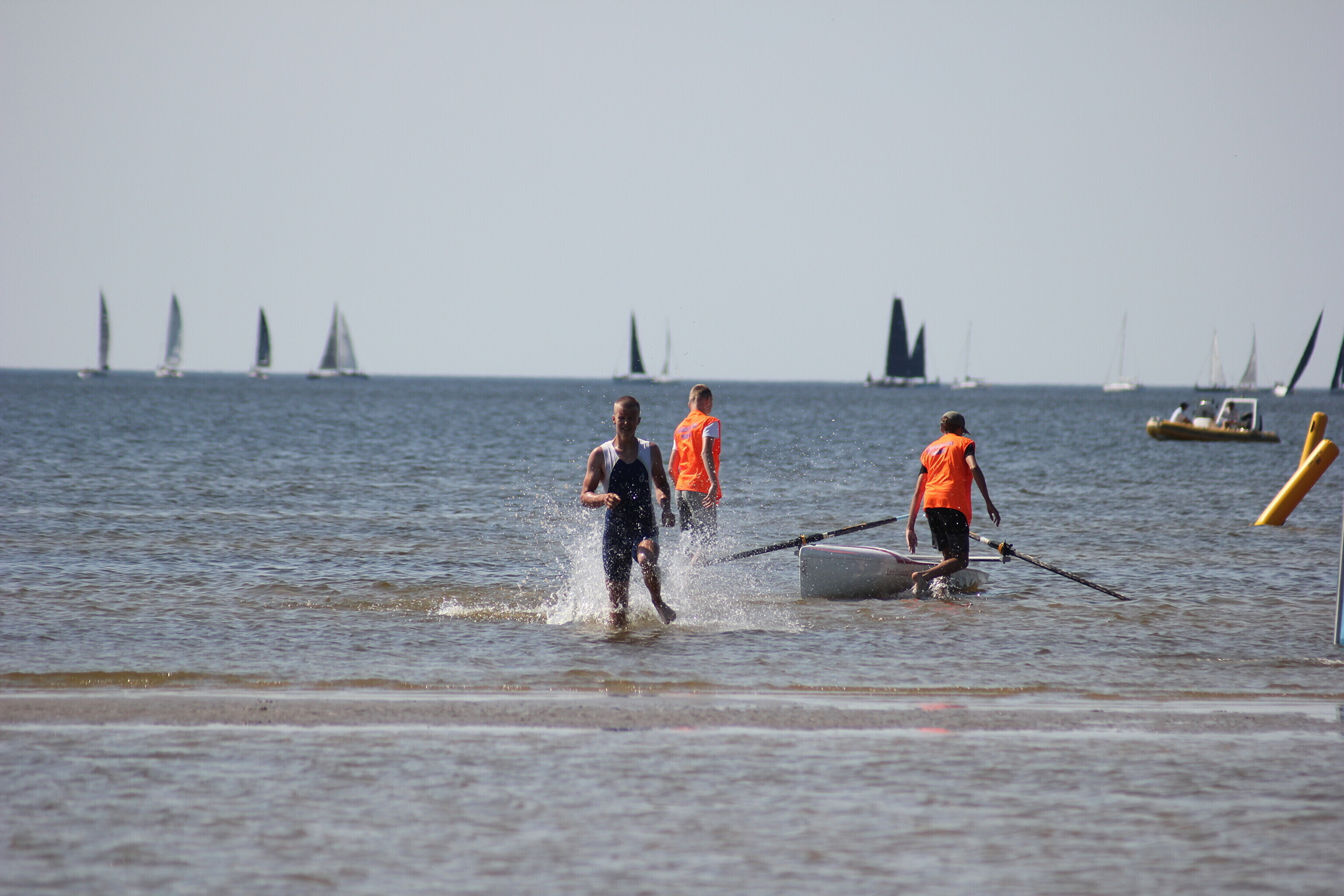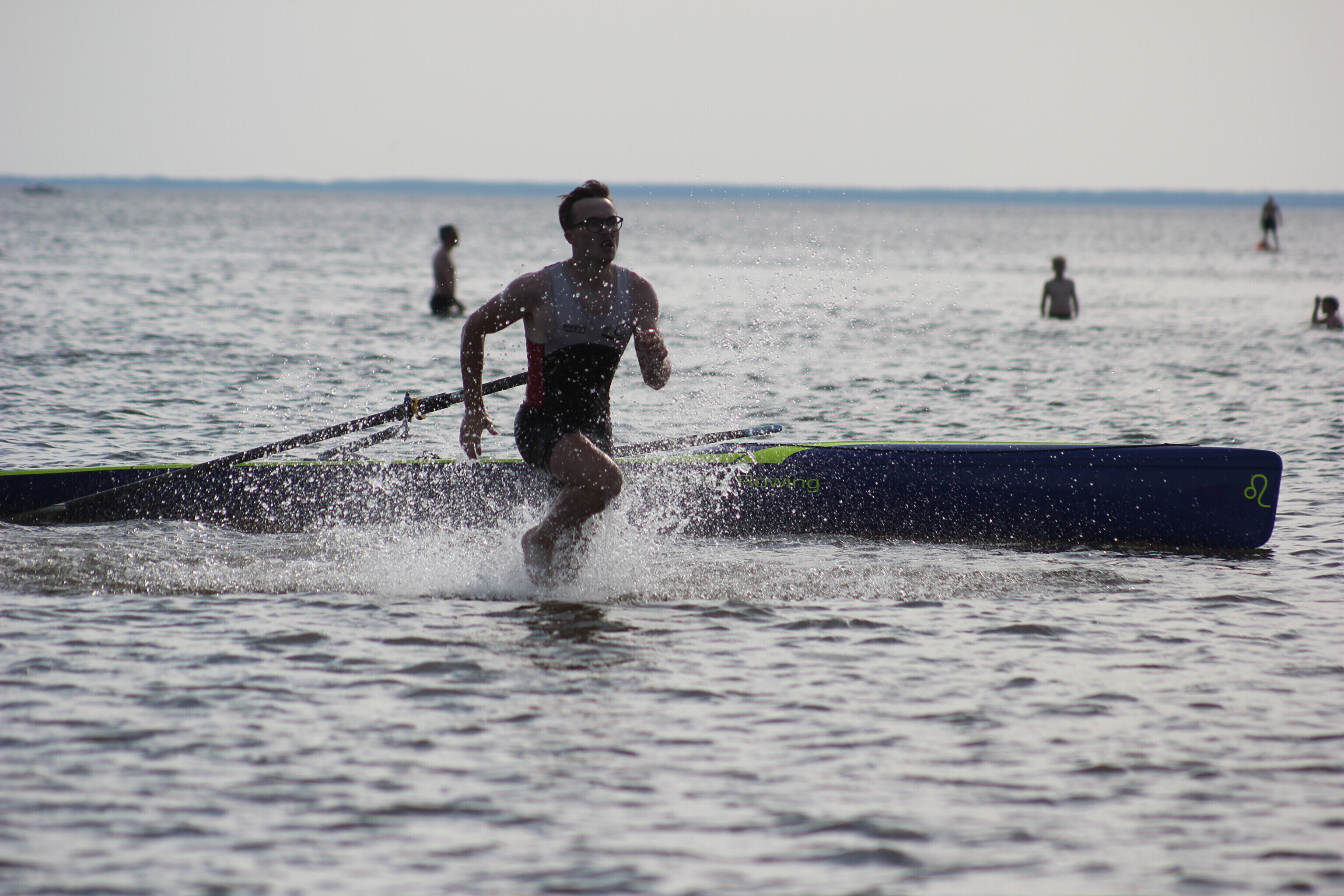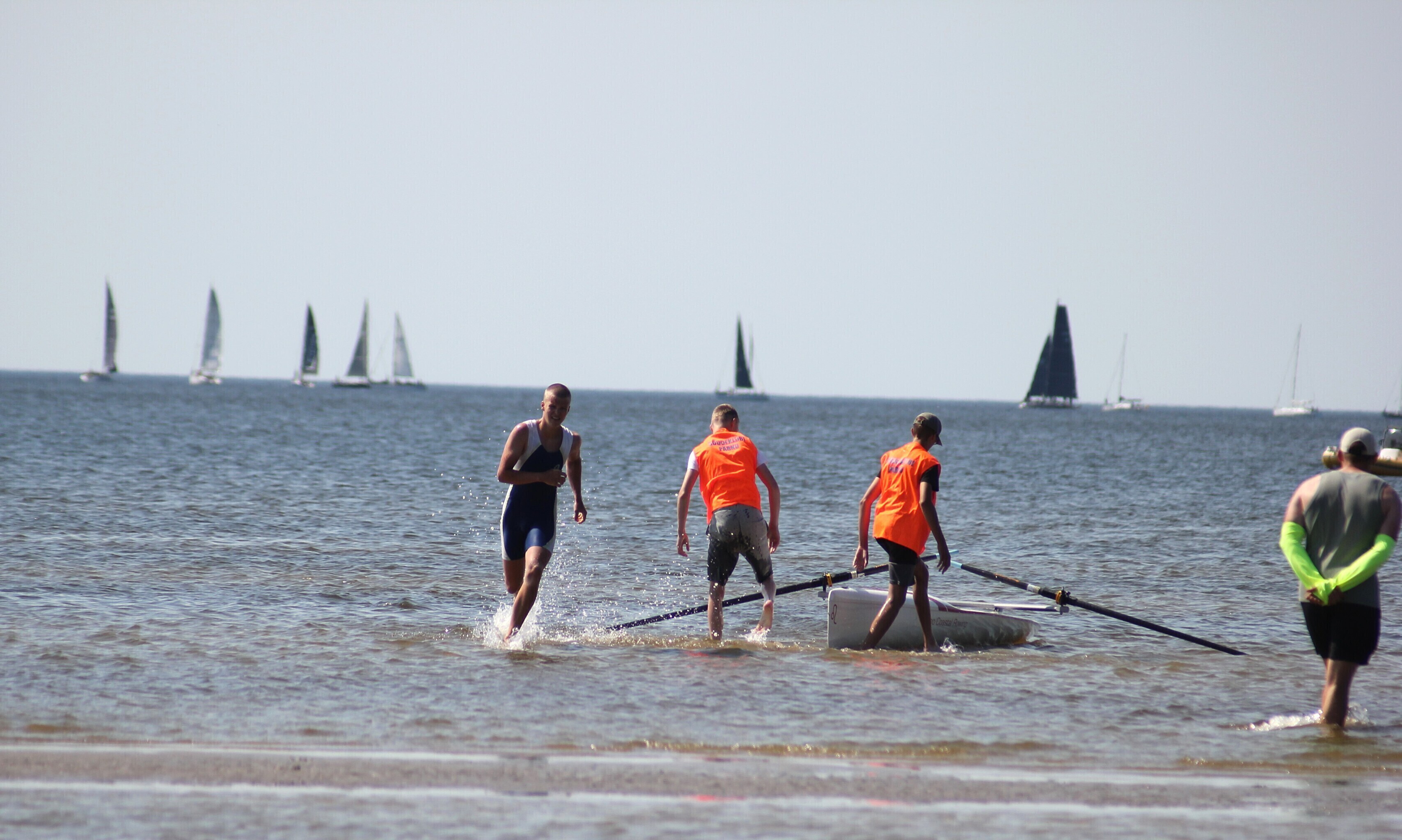– võistlejad jooksevad veepiirini (u 10-50 m), kus neid ootab sõudmiseks valmis pandud paat;