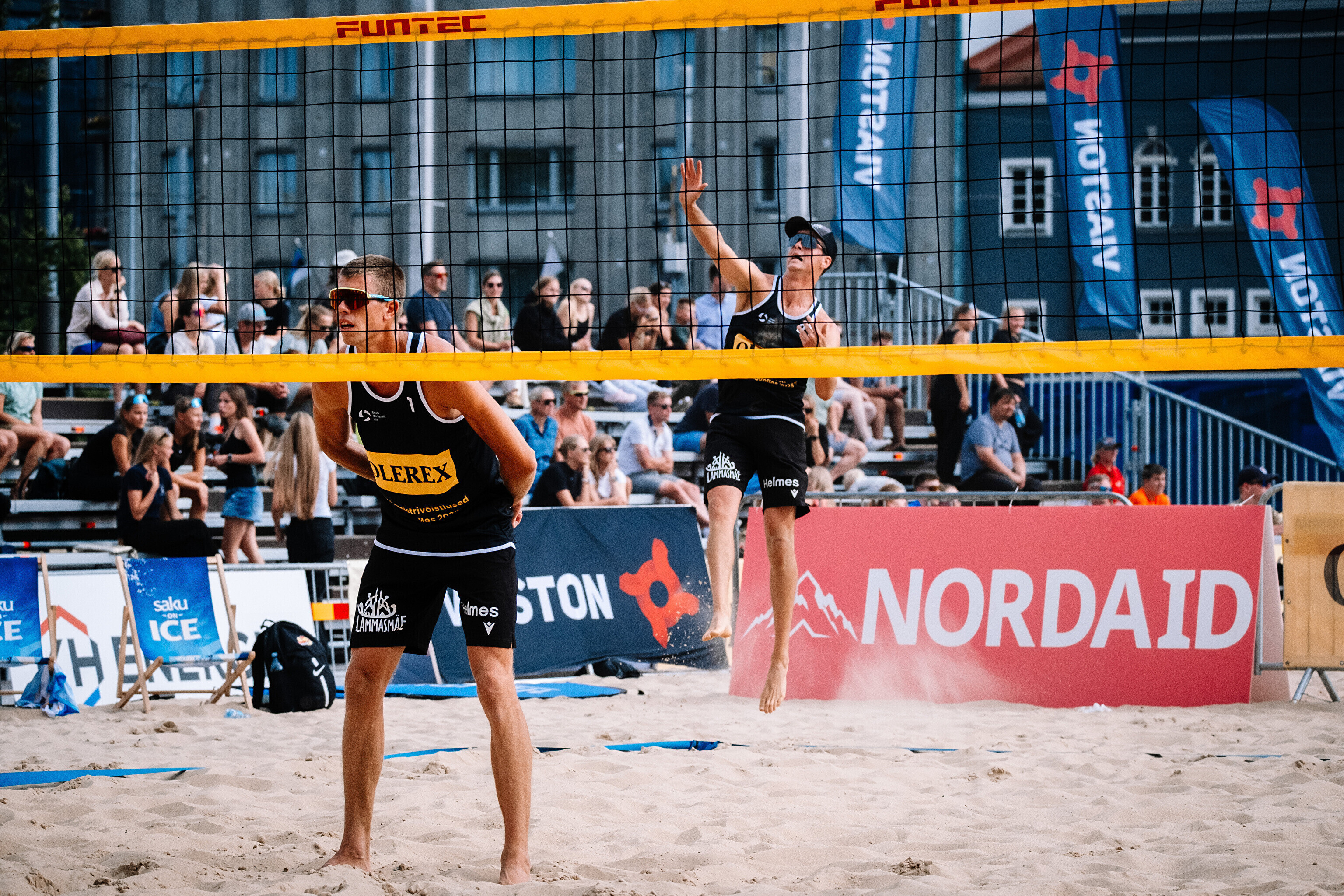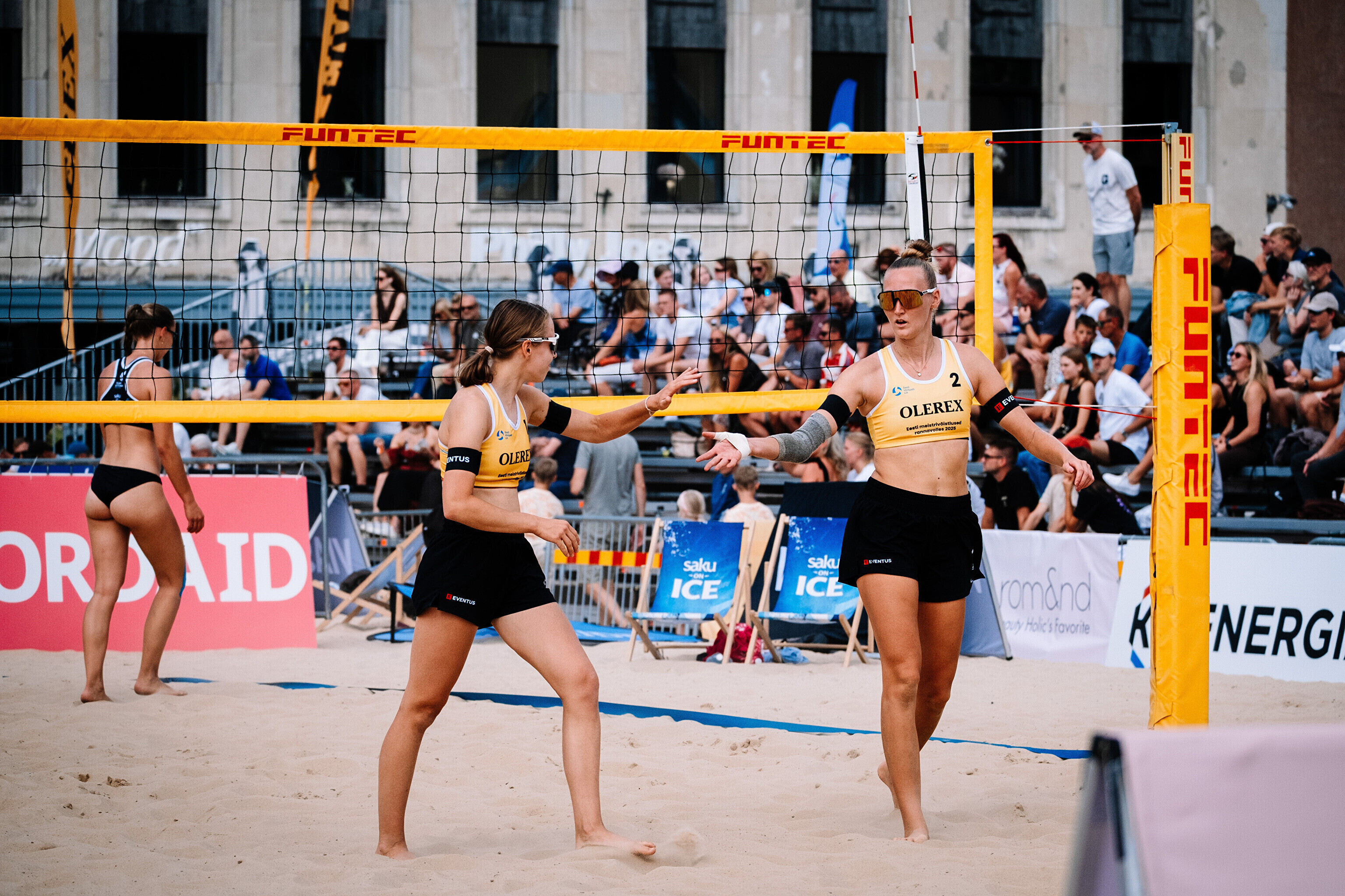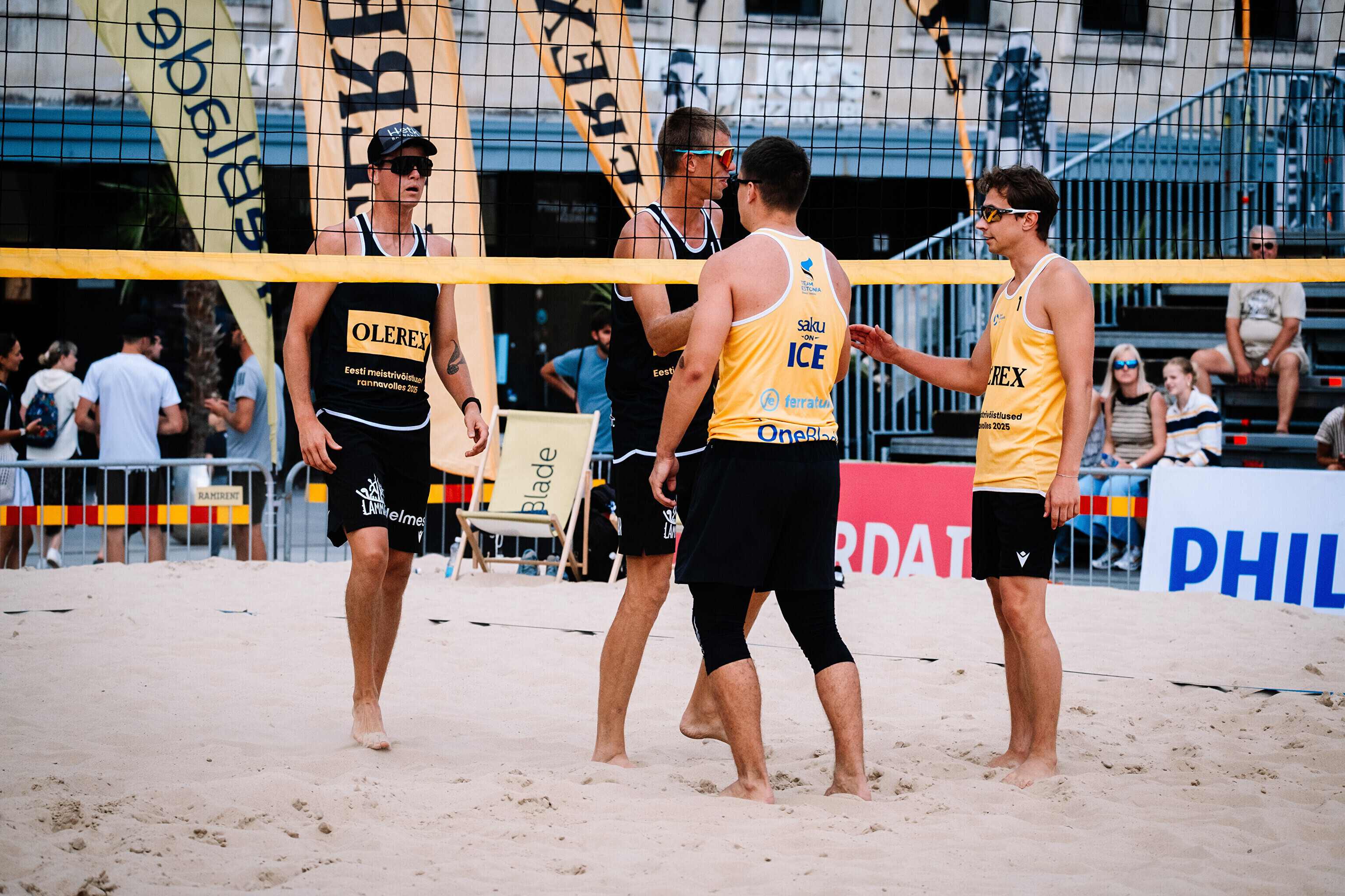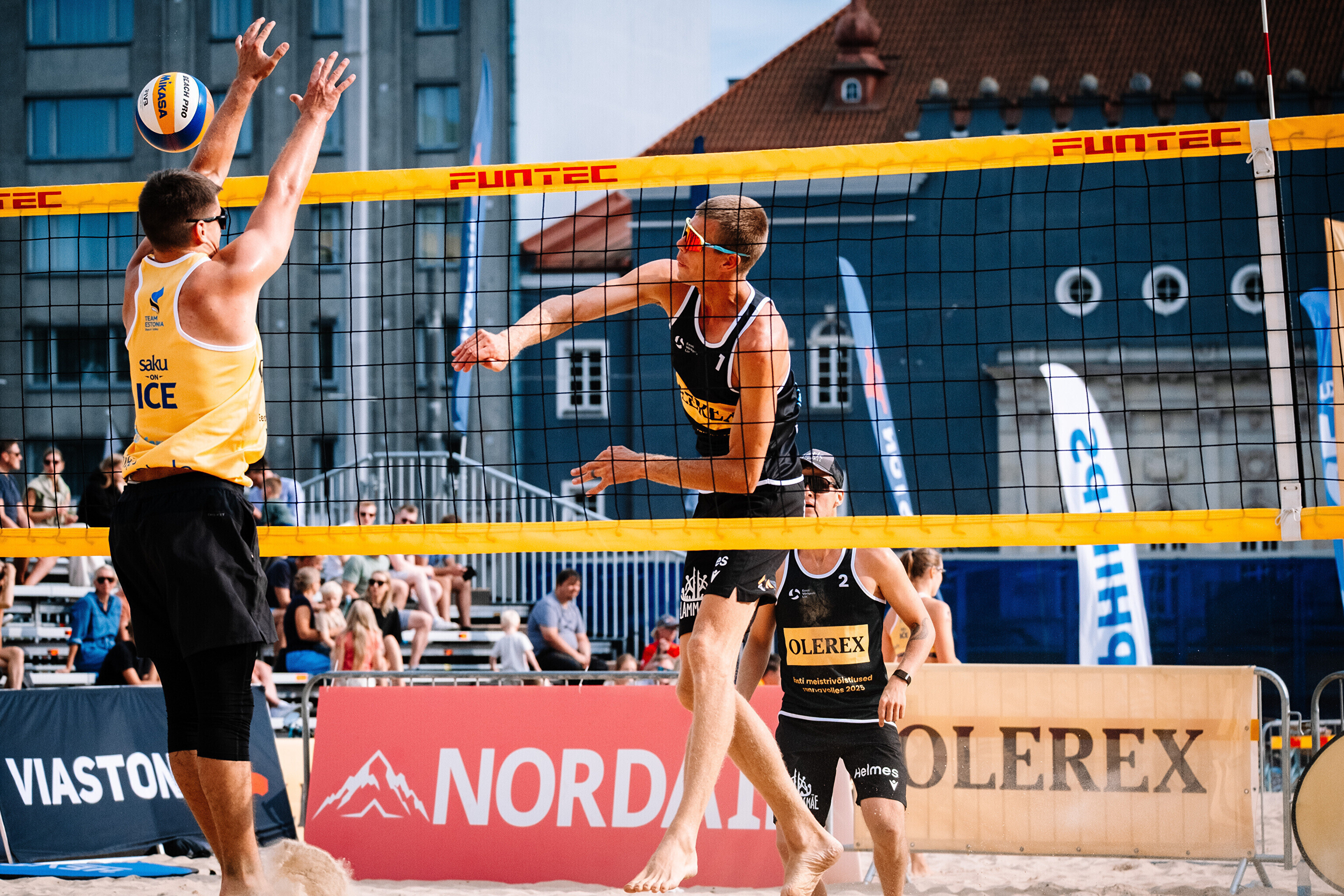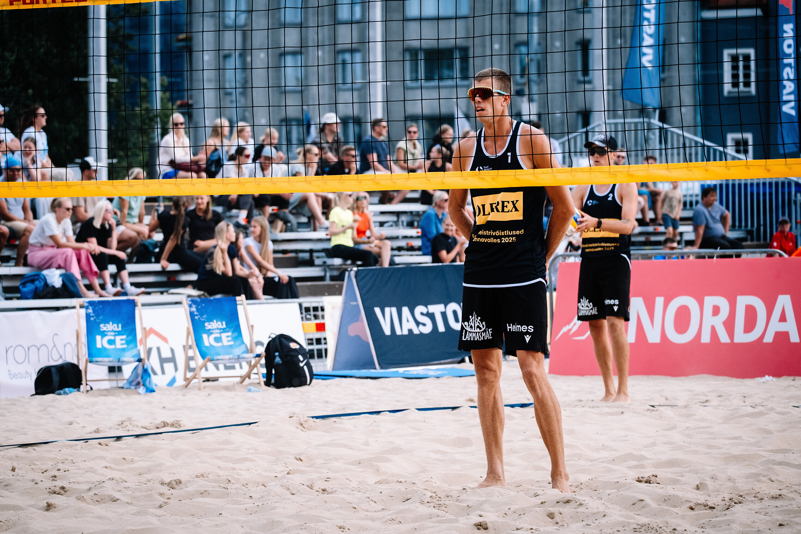 Neljapäevast pühapäevani toimuvad Tallinna südames Vabaduse väljakul Olerex Eesti meistrivõistlused rannavõrkpallis, kus on kahe põhiturniiri päeva järel selgunud veerandfinalistid.