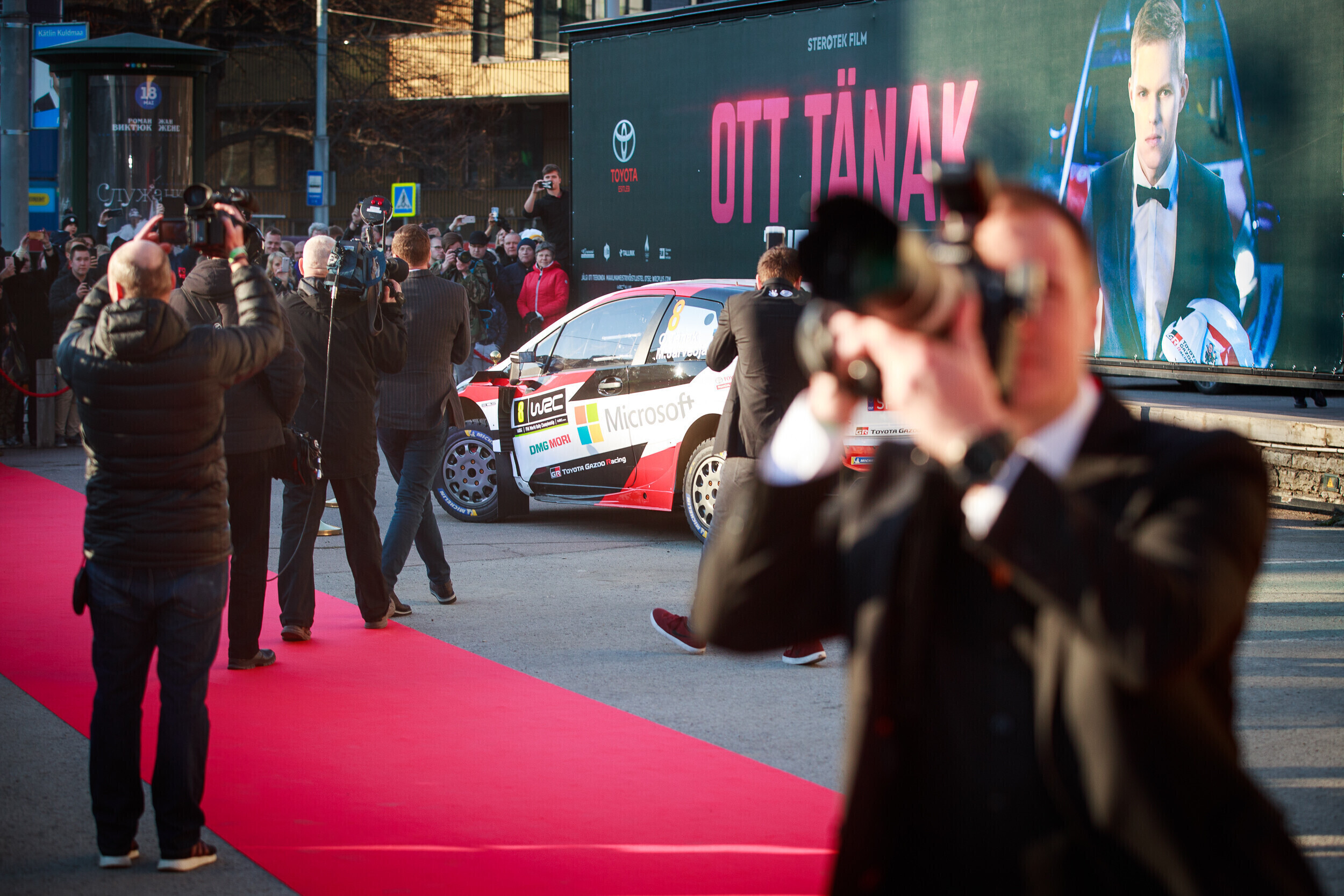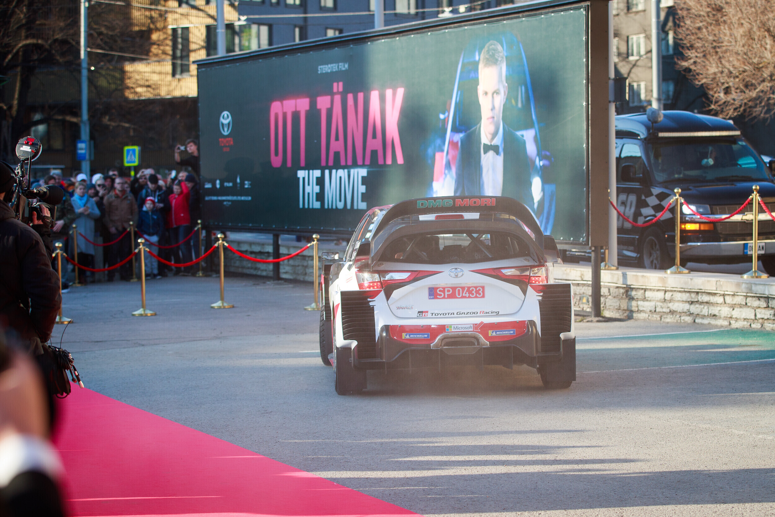 Ott Tänak - Martin Järveoja sõitsid Kosmose kinos toimuvale pidulikule esilinastusele Toyota WRC autoga. Mehed alustasid sõitu Peetris asuvast Toyota Gazoo Racingu garaažist.
